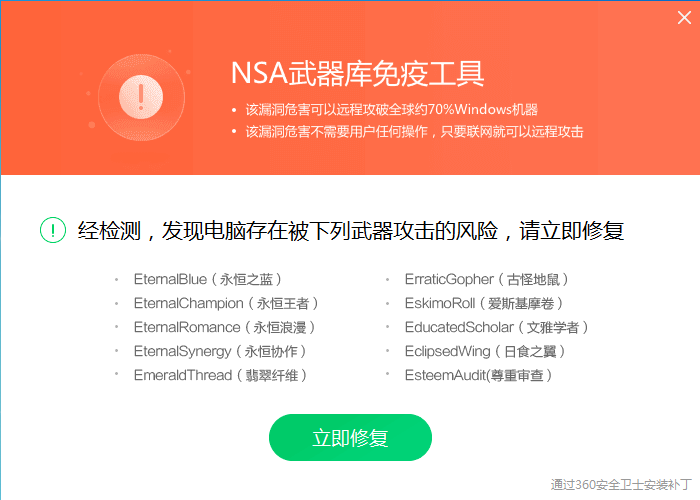 美国国家安全局(NSA)的黑客武器库遭曝光,其中有多个远程攻击Windows系统的武器已在网上公开,任何人都可以使用NSA的武器攻击其他电脑。对此,360安全卫士于4月19日晚间紧急推出“NSA武器库免疫工具”,可一键检测修复漏洞、关闭高风险服务,从而全面免疫预防NSA黑客武器。