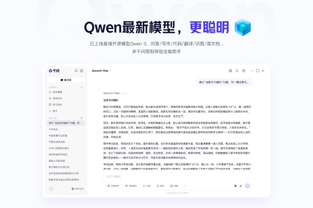 【Qwen最新模型,更聪明】已上线最强开源模型Qwen 3,问答/写作/代码/翻译/识图/读文档...来千问即刻体验全能助手。
