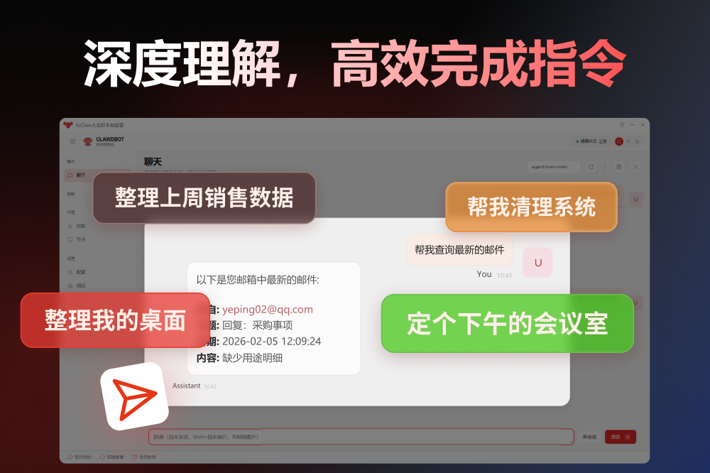 OpenClaw,大龙虾本地部署,龙虾一键安装,EzClaw本地部署,OpenClaw本地部署工具,EzClaw大龙虾本地部署是基于爆火的大龙虾AI打造的一款“零技术门槛、高隐私安全、全场景适配”的本地AI智能助手。无需专业技术储备,无需复杂命令行操作,一键即可完成部署,让普通用户都能轻松享受AI自动化带来的高效便捷。适用场景:本地文件管理、网页自动化、手机远程指令控制、自动生成每日晨报、设置待办提醒、撰写计划、代码辅助等,为您的日常工作学习提高效率。
