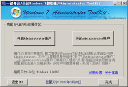 大家都知道windows7默认初次安装原版之后的账户并不是administrator,而是继承administrator的权限工作的,在安全性方面取得了重大突破,不过期望于使用administrator权限的用户还是希望能够拥有所有权限,很多时候打开软件都提示是否“以管理员身份”运行等等,在此这款小工具制作的目的就是为了方便大家一键式工作,避免手动操作的繁琐过程。
