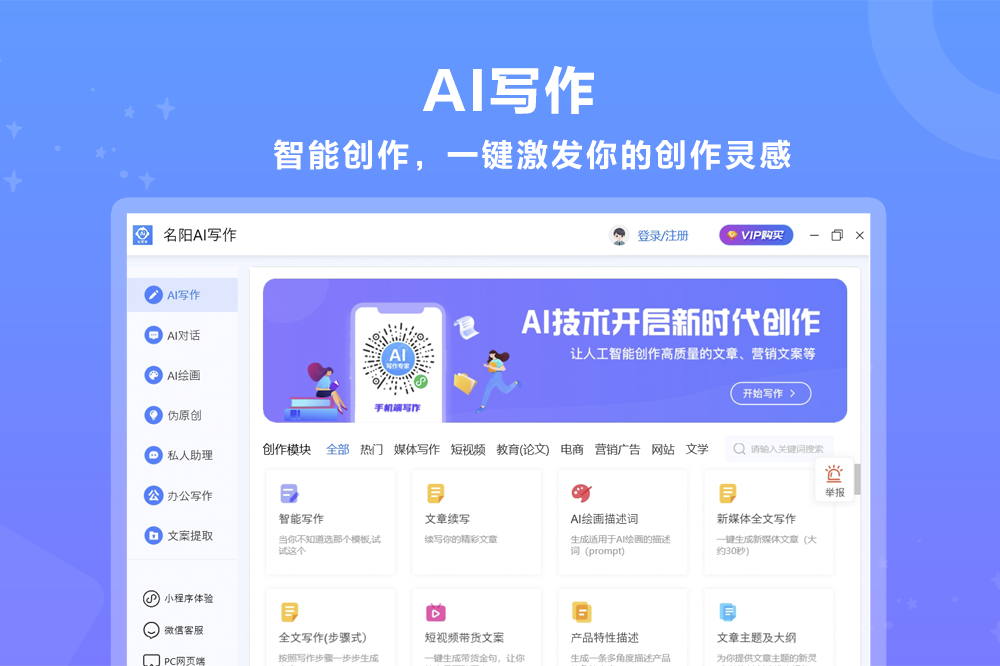 名阳AI写作是一款智能写作文章和AI聊天对话生成软件,自带一键生成写作、AI智能对话等功能,可以协助创作,便捷地获取思路和灵感,输入自己感兴趣的标题内容就可以一键生成对应文章,支持复制,编辑,拍照取字。也可以帮助你解决各式各样的难题,如生活中的麻烦、学习上的难题、工作中的困扰等,为你提出解决方案。 【AI创作】输入关键词,一键智能创作,可以为您提供创意灵感,帮助您轻松写作。 【AI对话】AI写作猿是您的百科全书,能解答各种问题,无论是学术知识、实用技巧还是兴趣爱好。只需提出问题,就能为您解答疑惑,提供准确、全面的答案。 【AI绘画】输入自己想要的画面描述,它就能一键式生成色彩绝伦,画面精美的AI绘画图片,无论您的想法多天马行空,只要描述得当都能满足你的需求。 【私人助理】 工作效率提升、生活百科解惑、知识技能学习,都能满足您的需求,让AI写作猿成为您工作和学习中的得力助手! 【热门创作】 1、文章续写-输入续写字数,根据上下文,智能续写契合的下文。 2、摘要生成-内容太多?帮你筛选重要信息,一键生成摘要! 3、文本比较-将原文和另外一段文字进行对比,标出不同处,让对比一目了然!