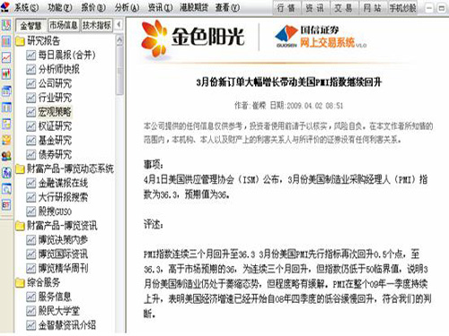 国信金太阳网上交易增加金色阳光服务专用展示界面,呈现现有的金色阳光服务数据内容,为公司金色阳光高端客户提供一个集行情、交易、金色阳光服务三合一的投资平台,以满足经纪业务建立差异化服务体系的需求,同时在交易功能上进行完善,性能上要求通道优先,保证金色阳光客户享受更多优质服务。