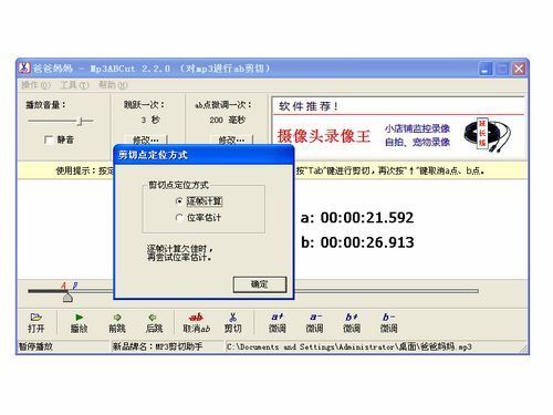 一款免费的MP3剪切器,从MP3音乐、歌曲文件中切割出需要的片段,制作自己的手机铃声、截取歌曲等。《Mp3ABCut》软件特征:1. 边听边设置a、b剪切点,快捷键如下:* (↓)播放、暂 停。* (→)向前跳跃。* (←)向后跳跃。* (↑)剪切点(a/b)定位键。2. 音质保障:直接剪切mp3文件,没有音质损失。3. 保留ID3Tag:保留原文件的各种标签信息。4. 剪切点微调( 毫秒级):工具条有剪切点微调按钮(a+、a-、b+、b-)。
