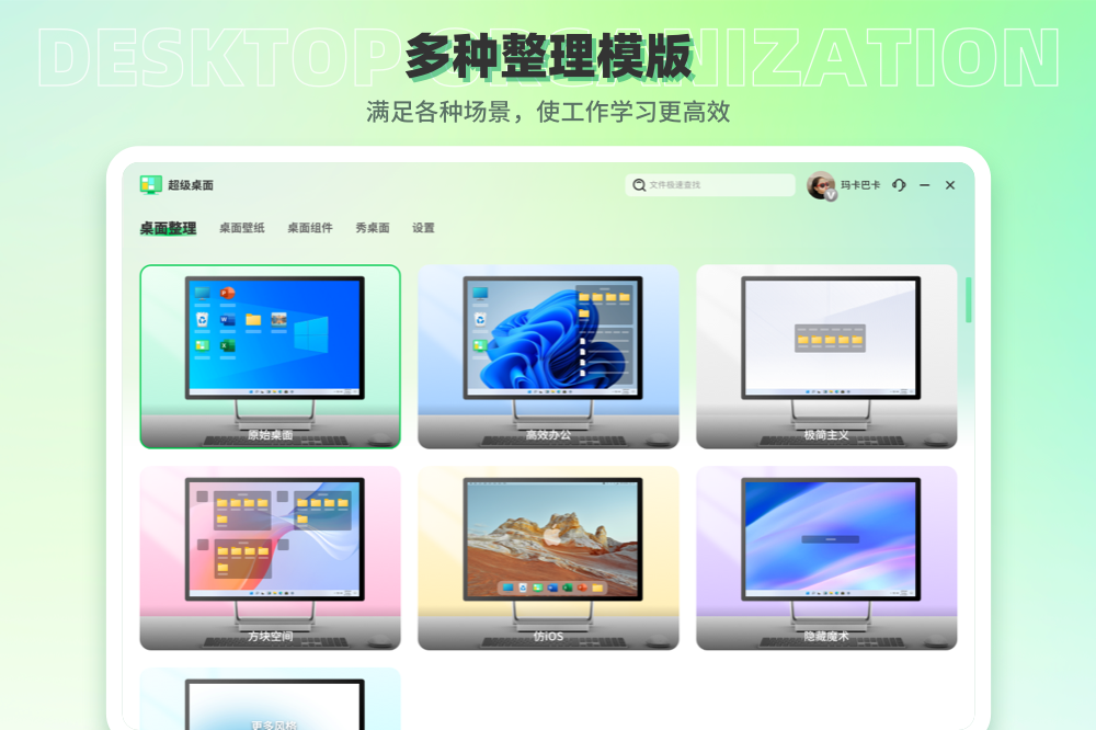 一款简单好用的桌面整理类软件! 支持一键整理电脑桌面各类文件,您再也不用为电脑桌面杂乱无章而烦恼了。目前支持高效办公、极简主义、方块空间等多种风格的整理方式。